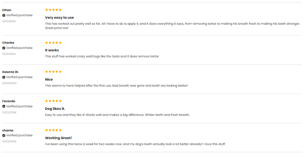 “I have tried a million different ways to brush my dogs teeth, especially since the vet cleaning is super expensive, and she refuses to let me do it no matter what I've tried. She clenches her jaw so tight. Accumulated tartar over the years looks very disgusting. And he has a serious bad breath. Since I used Pet Oral Repair Gel, he wouldn't refuse at all because he likes the taste. After a few days of use, the tartar is completely removed, the teeth look much cleaner. And the breath is fresh. Really recommend this product”